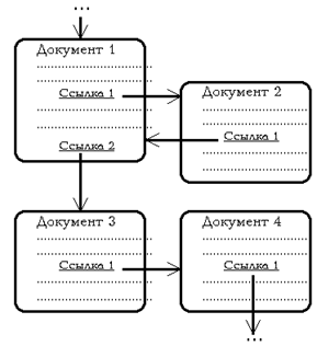 Информация в WWW представляется в виде документов, каждый из которых может содержать каквнутренние перекрестные ссылки, так иссылки на другие документы, хранящиеся на том же самом или на любом другом сервере. Такие ссылки называютгиперссылкамиилигиперсвязями. На экране компьютера в окне программы просмотра ссылки выглядят как выделенные каким-либо образом (например, другим цветом и/или подчеркиванием) участки текста или графики.