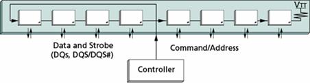 Отличительной особенностью схемотехнического дизайна модулей памяти DDR3 является применение «сквозной», или «пролетной» (fly-by) архитектуры передачи адресов и команд, а также сигналов управления и тактовой частоты отдельным микросхемам модуля памяти с применением внешнего терминирования сигналов (резистором, расположенным на модуле памяти). Схематически эта архитектура представлена на рис. 6. Она позволяет добиться увеличения качества передачи сигналов, что необходимо при функционировании компонентов при высоких частотах, типичных для памяти DDR3 и не требуется для компонентов памяти стандарта DDR2.