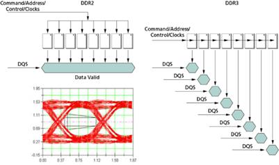 Различие между способом подачи адресов и команд, сигналов управления и тактовой частоты в модулях памяти DDR2 и DDR3 (на примере модулей, физический банк которых составлен из 8 микросхем разрядностью x8) представлено на рис. 7.