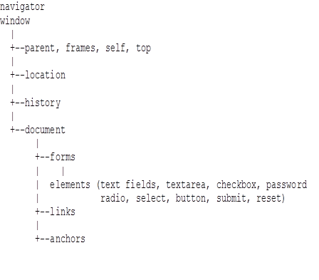 Об'єкт window є батьківським стосовно всіх інших об'єктів Navigator. Прямими нащадками об'єкта window є об'єкти location, history й document. Об'єкти forms, links й anchors є дочірніми для об'єкта document.