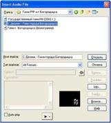 Для добавления в проект изображения следует выполнить команду главного меню программы «Вставка» → «Аудиофайл…». Будет выведено диалоговое окно добавления аудиофайла в проект (см. рисунок 16). С помощью элемента управления «Папка» и области выбора файлов ниже, поля «Имя файла», «Тип файла» находим аудио трек к проекту. В данном диалоговом окне выбранный файл можно прослушать, нажав на кнопку ► в нижней части окна. Для получения информации о файле (тип, битрейд, длина и прочие) нужно щёлкнуть на кнопке «Inf o…». Непосредственно вставка файла осуществляется после щелчка на кнопке «О ткрыть».