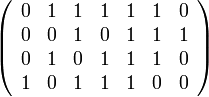 Пусть выбран примитивный полином, задающий цикл де Брейна 0010111001011100… и блок данных 0111110, построена таблица, верхняя строка заполнена блоком данных, а нижние строки — смещения на 0,1,2 бит цикла де Брейна