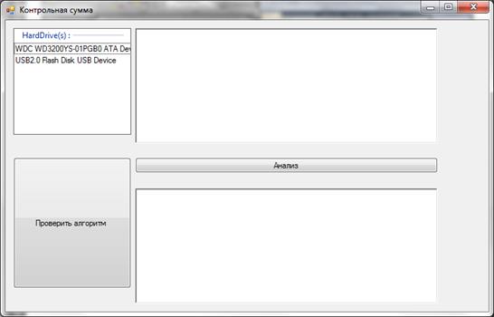 1. Основное окно программы – список для вывода подключенных устройств памяти, а также выбора между ними, текстовое поле выводящее информацию о выбранном устройстве, кнопка анализа, текстовое поле хранящее информацию не зависимо от выбора, для сравнения, кнопка проверки алгоритмов.