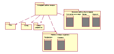 Важливим завданням систематизації інформації про предметну область є розбивка великої системи на невеликі підсистеми. Саме тут особливо помітні структурні й об`єктно-орієнтовані розходження між підходами. Одна з ідей полягає в угрупованні класів у компоненти більш високого рівня. В UML такий механізм угруповання носить назву пакетів (package). Діаграмою пакетів є діаграма, що містить пакети класів і залежності між ними. Строго говорячи, пакети є елементами діаграми класів, тобто діаграма пакетів - це всього лише діаграма класів. Відрізняються ці діаграми практичним призначенням і використанням. Залежність між двома елементами має місце в тому випадку, якщо зміни у визначенні одного елемента можуть спричинити зміни в іншому.