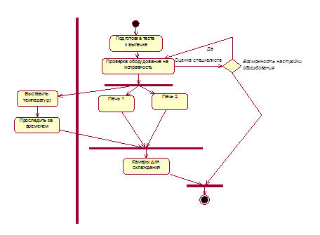 Отже, в цій курсовій роботі я реалізував механізм роботи пекарні за допомогою засобів UML, а саме використанням програмного продукту Rational Rose. Також я спроектував автоматизовану модель цього виробництва за допомогою AllFusion Process Modeler. Ці програми ідеально підходять для аналізу системи, адже вони оцінюють її з різних сторін, а також вглиблюючись у якусь галузь роботи та створюючи загальну картину. Якшо BPwin описує загальний процесс за допомогою діаграм трьох типів, робить вартісний аналіз, оцінює затрачені кошти, а також вглиблюється майже в кожну діяльність, то в Rational Rose все інакше. Він аналізує стани в яких знаходиться діяльність, аналізує час виконання кожної процедури, створює систему відправки пакетів для зв’язку всієї процедури виготовлення виробів.