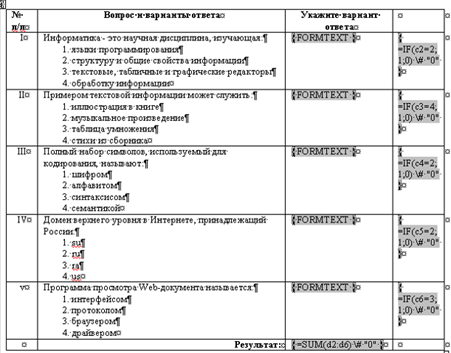 Задание 2. Освоить основные принципы создания компьютерных тестов средствами текстового процессора MSWord.