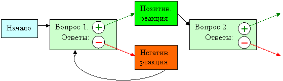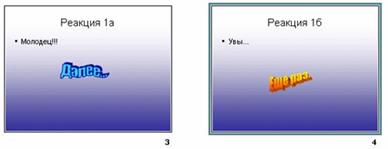 2. Из схемы вытекает реализация: если у нас есть N вопросов, то необходимо создать в Powerpoint 3N+1 слайдов: 1 для вступления, по три слайда на каждый вопрос, имея в виду два слайда с положительной и отрицательной реакциями.