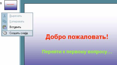 5. Поместим на словах Перейти к первому вопросу… гиперссылку на слайд №2 (с первым вопросом). Для этого перейдем на слайд №1, выделим соответствующую надпись, после чего: