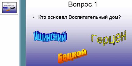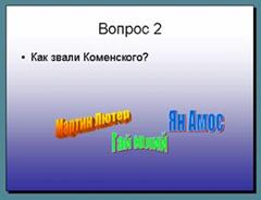 Теперь, если мы в режиме просмотра слайдов наведем указатель на надпись, он примет вид ладони. Левый щелчок приведет нас к первому вопросу.