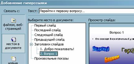После появления окна Добавление гиперссылки необходимо выбрать местом в документ слева, а затем щелкнуть по названию слайда с первым вопросом.