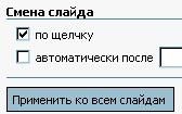 Чтобы этого избежать (ведь тогда после появления слайда с положительной реакцией вместо следующего вопроса мы бы увидели отрицательную реакцию), нужно запретить переход по щелчку. Для этого: выберем Показ слайдов ® Смена слайдов , после чего в правой части окна появится соответствующая панель области задач.