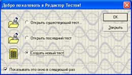 - В приветствии щелкнуть в окошко Создать новый тест→ Ok .
