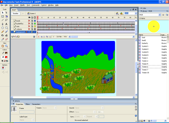 5. Создадим анимацию солнца и двух воздушных шаров на новом слое, как и в случае с анимацией фона, используем MotionTwin. На первом кадре устанавливаем начальное положение шаров и солнца и используем команду CreateMotionTwin. На кадре, который будет воспроизводиться последним, меняем положение шаров и солнца, для создания эффекта их движения. Применяем InsertFrame. Результатом этих действий будет планомерное движение шаров и солнца от месторасположения на первом кадре до месторасположения на последнем по прямой (рис.10, рис. 11).