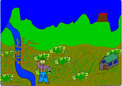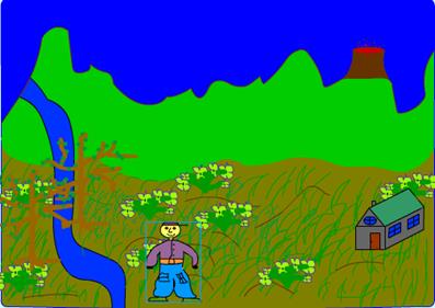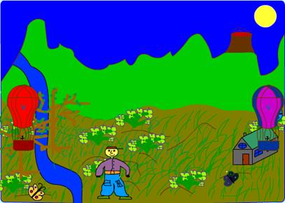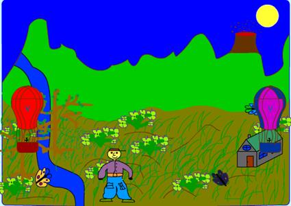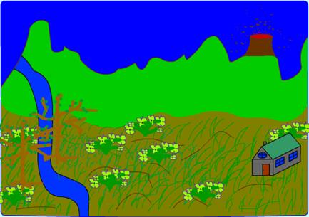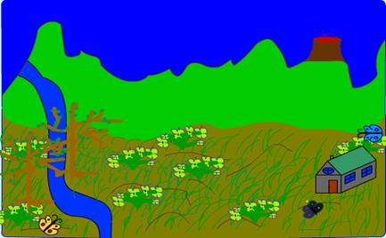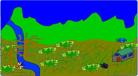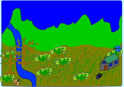 1. Создадим слой заднего фона ролика. При помощи основных элементов расположенных на панели Tools в первом кадре рисуем горы, деревья, дом , а также траву и кусты (рис. 1).
