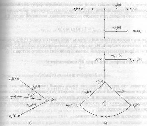 С целью анализа главных компонентов для входного сигнала произвольной размерности возможно применение технологии обучения нейронных сетей (рис. 2.6). Сеть прямого распространения с одним слоем линейных нейронов, модифицируемая по обобщенному правиле Хебба, образует устройство - фильтр Хебба. Фильтр извлекает главные компоненты из входного сигнала в пространстве собственных векторов, которыми являются веса нейронов. Число компонент соответствует числу ортосистем, то есть числу весовых систем и соответственно равно числу нейронов сети. Таким образом, всегда будет достижима задача аппроксимации ковариационной матрицы входного случайного сигнала заданной размерности.