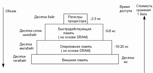Память вычислительной машины представляет собой иерархию запоминающих устройств (ЗУ), отличающихся средним временем доступа к данным, объемом и стоимостью хранения одного бита.