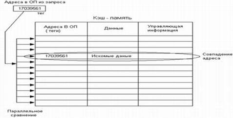 При каждом обращении к основной памяти по физическому адресу просматривается содержимое кэш-памяти с целью определения, не находятся ли там нужные данные. Кэш-память не является адресуемой, поэтому поиск нужных данных осуществляется по содержимому — по взятому из запроса значению поля адреса в оперативной памяти.