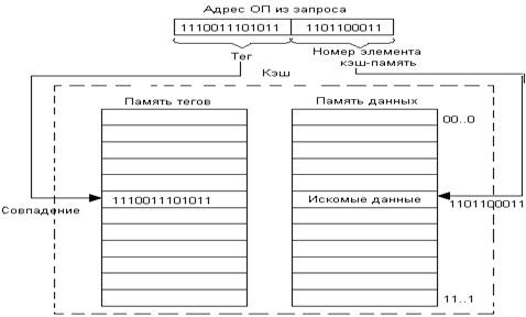 При поиске данных в кэше используется быстрый прямой доступ к записи по номеру строки, полученному путем обработки адреса оперативной памяти из запроса. Однако поскольку в найденной строке могут находиться данные из любой ячейки оперативной памяти, младшие разряды адреса которой совпадают с номером строки, необходимо выполнить дополнительную проверку. Для этих целей каждая строка кэш-памяти дополняется тегом, содержащим старшую часть адреса данных в оперативной памяти. При совпадении тега с соответствующей частью адреса из запроса констатируется кэш-попадание.