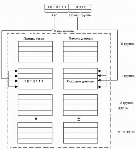 Во многих современных процессорах кэш-память строится на основе сочетания этих двух подходов, что позволяет найти компромисс между сравнительно низкой стоимостью кэша с прямым отображением и интеллектуальностью алгоритмов замещения в кэше со случайным отображением. При смешанном подходе произвольный адрес оперативной памяти отображается не на один адрес кэш-памяти (как это характерно для прямого отображения) и не на любой адрес кэш-памяти (как это делается при случайном отображении), а на некоторую группу адресов. Все группы пронумерованы. Поиск в кэше осуществляется вначале по номеру группы, полученному из адреса оперативной памяти из запроса, а затем в пределах группы путем ассоциативного просмотра всех записей в группе на предмет совпадения старших частей адресов оперативной памяти.