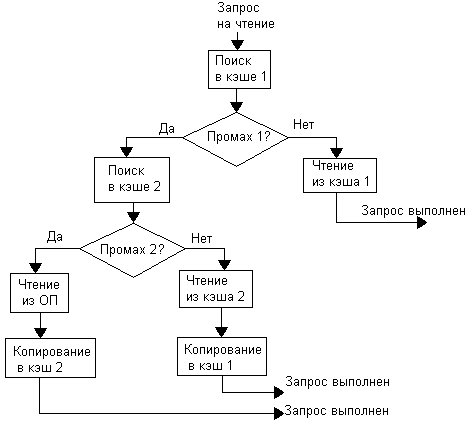 На рисунке показана схема выполнения запроса на чтение в системе с двухуровневым кэшем. Сначала делается попытка обнаружить данные в кэше первого уровня. Если произошел промах, поиск продолжается в кэше второго уровня. Если же нужные данные отсутствуют и здесь, тогда происходит считывание данных из основной памяти. Понятно, что время доступа к данным оказывается минимальным, когда кэш-попадание происходит уже на первом уровне, несколько большим — при обнаружении данных на втором уровне и обычным временем доступа к оперативной памяти, если нужных данных нет ни в том, ни в другом кэше. При считывании данных из оперативной памяти происходит их копирование в кэш второго уровня, а если данные считываются из кэша второго уровня, то они копируются в кэш первого уровня.
