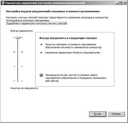 Чтобы повысить уровень безопасности информации на данной АС воспользуемся функцией ОС Windows 7 "Параметры контроля учетных записей". Контроль учетных записей (UAC) используется для уведомления пользователя перед внесением изменений, требующих прав администратора. По умолчанию уведомления контроля учетных записей отображаются при попытке изменения параметров компьютера программами, но при необходимости можно изменить частоту уведомлений контроля учетных записей.