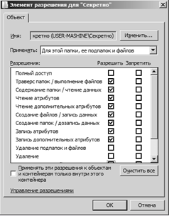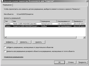 Предоставим группе пользователей Секретно все права кроме удаления. Очевидно Пользователь №4, не входящий в состав данной группы, не получит права доступа к данной папке.