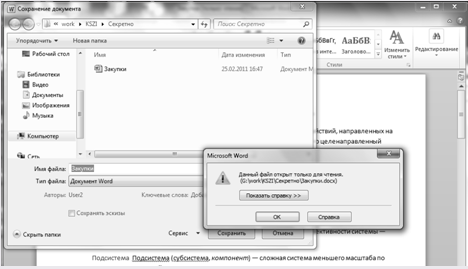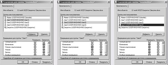 Пользователю №2 позволим лишь читать данный документ, но не модифицировать и записывать. Такой набор прав означает защиту свойства целостности информации. Права на чтение и изменение документа предоставим пользователю №3, показав свойство доступности информации.