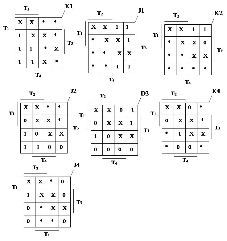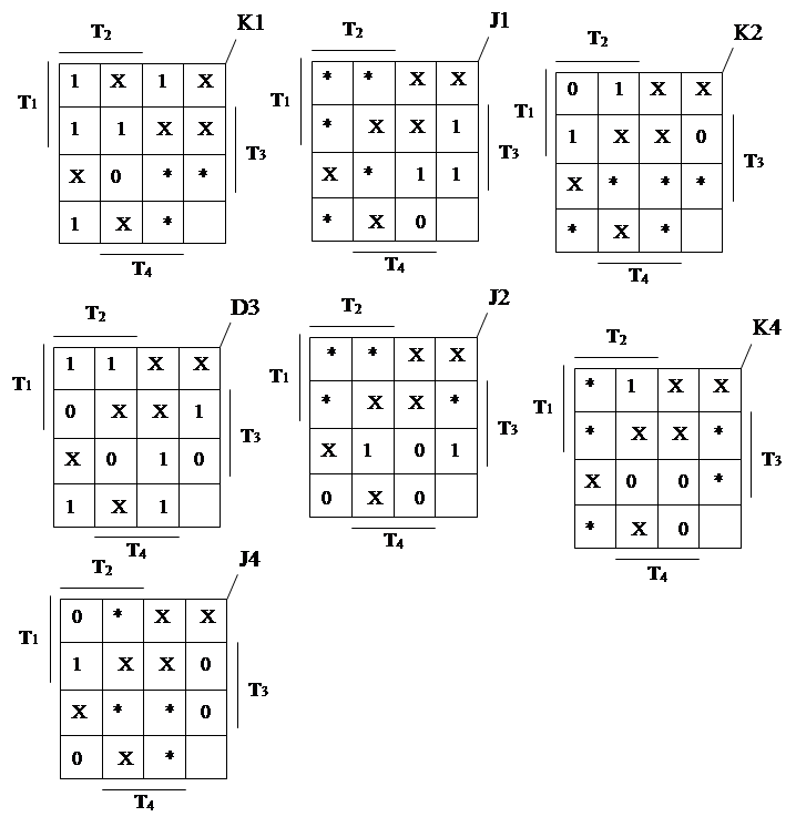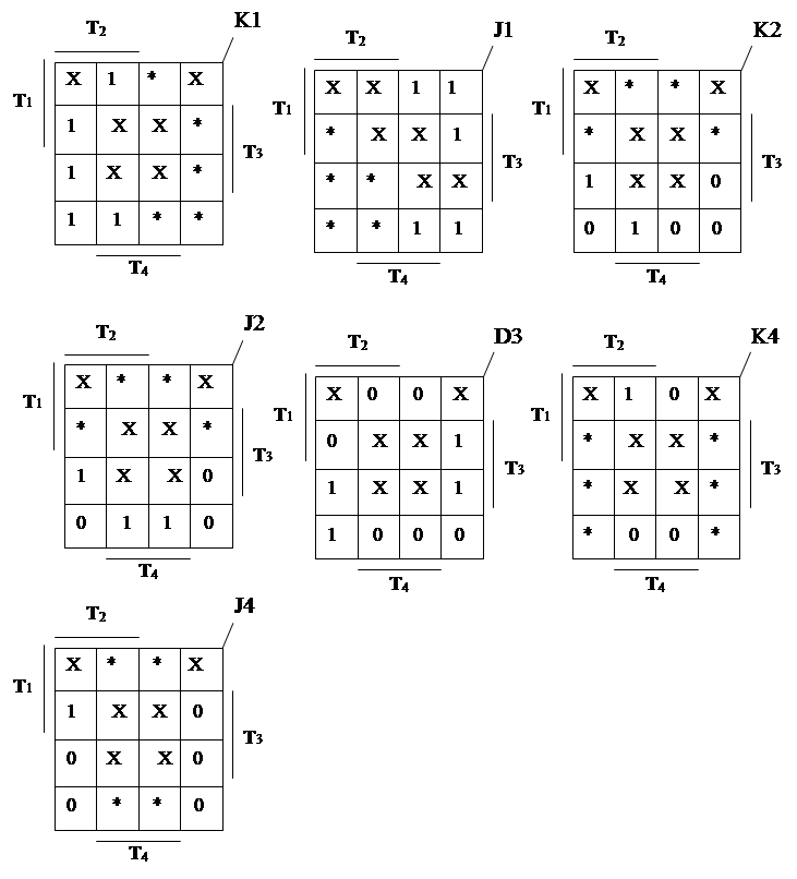 Згідно діаграм Вейча запишемо значення функцій на D- та JK- входах тригерів для цього випадку.