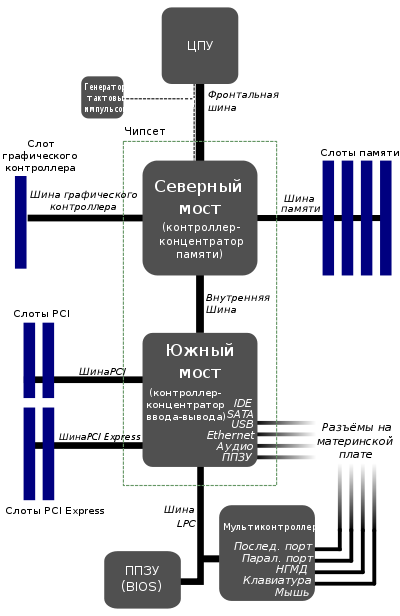 Северный мост - его функции заключаются в обеспечение взаимодействия процессора, ОЗУ и видеоадаптера.