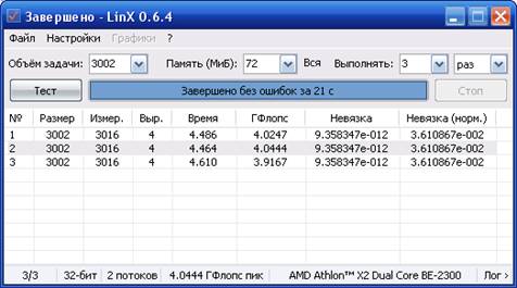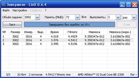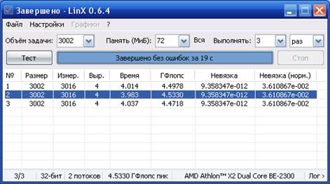 Результаты показали, что производительность МП упала на 0.45 ГФлопс и скорость работы процессора тоже упала в среднем на 0.5 с. Такой результат можно посчитать вполне нормальным. После удаления лишних программ из процессора и освобождения ОЗУ результаты вернулись в среднем на тот же уровень. Скоростной показатель этой карты нельзя показать на 100% , в виду занятости системных программ в памяти ОЗУ.