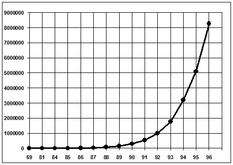 Спустя некоторое время TCP/IP был адаптирован в обычный, то есть в общедоступный стандарт, и термин Internet вошел во всеобщее употребление. В 1983 году из ARPANET выделилась MILNET, которая стала относиться к Defence Data Network (DDN) министерства обороны США. Термин Internet стал использоваться для обозначения единой сети: MILNET плюс ARPANET. И хотя в 1991 году ARPANET прекратила свое существование, сеть Internet существует, ее размеры намного превышают первоначальные, так как она объединила множество сетей во всем мире. Диаграмма 1.1 иллюстрирует рост числа хостов, подключенных к сети Internet с 4 компьютеров в 1969 году до 8,3 миллионов в 1994. Хостом в сети Internet называются компьютеры, работающие в многозадачной операционной системе (Unix, VMS), поддерживающие протоколы TCP\IP и предоставляющие пользователям какие-либо сетевые услуги.