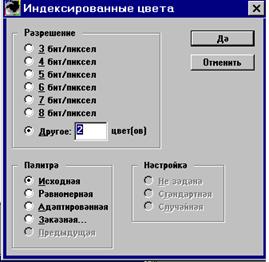 2.Задайте разрешение, палитру, и метод имитации цветов. Нажмите кнопку «Да».