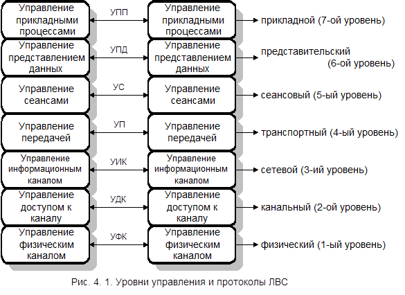 Организация ЛВС базируется на принципе многоуровневого управления процессами, включающими в себя иерархию протоколов и интерфейсов.