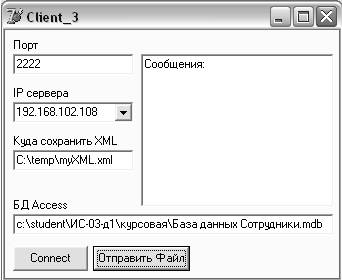 В приложении клиента использованы такие компоненты как поля, в которые заносятся данные об IP-адресе и порте сервера, указывается путь к БД Access, путь, где будет сохранен XML-документ, окно, в котором отображаются произошедшие события. Также добавлены две кнопки: Connect и Отправить Файл. Первая – для связи с сервером; вторая –для передачи XML-файла.