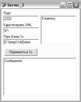 В приложении сервера использованы такие элементы управления, как поле для ввода номера прослушиваемого порта, поле для указания папки, в которую сохраняется полученный XML-документ, а также поле с указанием адреса БД 1С. Кроме этого, на форме добавлены два окна: первое – список подключенных клиентов; второе – произошедшие события. Также есть кнопка "Перенести в 1С", которая необходима для перенесения данных XML-документа в 1С.