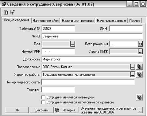 По данным, считанным с XML-документа происходит запись атрибутов в справочник "Сотрудники". При этом сначала проверяется, числится ли такой сотрудник уже на предприятии. Если ответ положительный, то изменяются только периодические реквизиты (такие как характер работы и оклад), иначе создается новый сотрудник по следующей схеме: