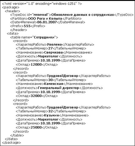 После того как на клиентском приложении будет нажата кнопка "Отправить", произойдет чтение последней записи из таблицы "ДатыОбновлений" (а именно 06.01.1998) из Access. После формируется XML-файла (см. рисунок 5) по данным таблицы "Сотрудники", с учетом даты последнего обновления. То есть заносятся данные о тех сотрудниках, где значение поля "ДатаПриема" (она же и дата увольнения, и дата каких-либо изменений периодических реквизитов) больше даты последнего обновления. Далее происходит передача по серверу.