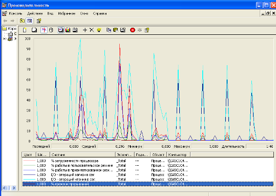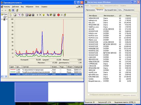 Одним из первых действий администратора является проверка Диспетчера задач. В нем возможно наблюдение за количеством работающих процессов, а также за процентом загруженности процессора. Далее с помощью счетчиков производительности: % работы в пользовательском режиме и % работы в привилегированном режиме, устанавливается какого рода деятельность занимается процессор. При одновременном просмотре результатов счетчиков и диспетчера задач возможно установить соответствие процесса пику на графике производительности (рис. 1).