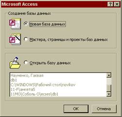 Після запуску програми Microsoft Access на екрані з’являється вікно додатка, a також діалогове вікно, в якому користувач має вибрати один із наступних варіантів роботи: створення порожньої бази даних (перемикач Нова база даних), створення бази даних за допомогою майстра (перемикач Запуск майстра ), відкриття однієї з існуючих баз даних (перемикач Відкрити базу даних ).