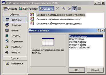 Рисунок 3. Діалогове вікно, яке дозволяє вибрати спосіб створення нової таблиці
