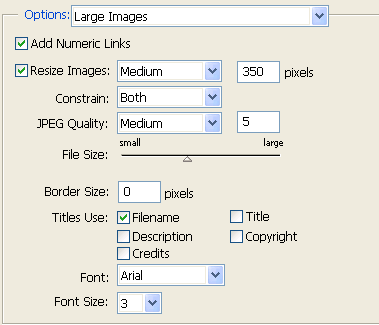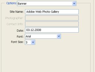 Погляньте на нижню частину діалогового вікна Web Photo Gallery , де розташовуються настройки розділу Options (Параметри). У списку, що розкривається, є декілька пунктів можливих настройок, які ми і розглянемо.