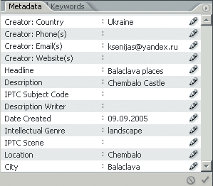 Метадані прописуються в програмі Adobe Bridge в розділі Metadata " IPTC Core . Туди ж можна внести як докладну інформацію про автора, так і опис файлу.