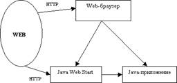Основные преимущества Java-приложений - это: богатый и дружественный интерфейс приложений. Приложения могут быть запущены не только посредством веб-браузера. Они могут быть выполнены из стартового меню или с рабочего стола. Также скорость работы не зависит от скорости соединения с Интернет. Помимо этого,приложения работают в off-line режиме. Работать с такой программой можно где угодно, пусть даже в самолете во время полета. Однако для обычных Java-приложений, помимо основной проблемы, упомянутой ранее, накладываются также трудности при установке и обновлении программы. Java Web Start позволяет разворачивать площадку для старта приложений непосредственно на веб-сайте. Нижеследующая схема показывает принцип работы Java Web Start технологии: