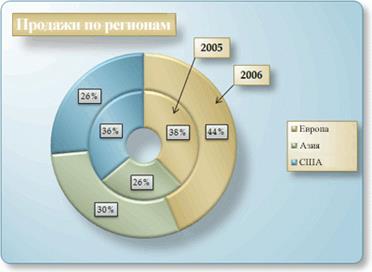 Данные, которые находятся в столбцах и строках только на листе, могут быть представлены в качестве кольцевой диаграммы. Как и круговая диаграмма, кольцевая диаграмма показывает отношение частей к целому, но этот тип диаграммы может включать несколькорядов данных. Каждый ряд данных, нанесенный на кольцевую диаграмму, добавляет к ней кольцо. Первый ряд данных отображается в центре диаграммы.
