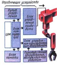 Каждый робот рассчитан на выполнение той или иной работы, которая и определяет его конструкцию, размеры, степень подвижности, число рук и пальцев на руке, грузоподъёмность, точность движения и т.д. Независимо от того, стоит ли робот возле станков, передвигается между ними или ползает под потолком, у него всегда есть мощная механическая рука с двумя или четырьмя пальцами. Роботы отличаются один от другого общим видом, габаритами и техническими характеристиками, но у них есть и общие признаки. На рис. 4 изображена структурная схема такого робота. Рукой управляет либо оператор с пульта, либо мозг робота – его ЦВМ (цифровая вычислительная машина). В блоке памяти находится программа действий робота, которую вводят в него или которую он приобретает во время обучения.