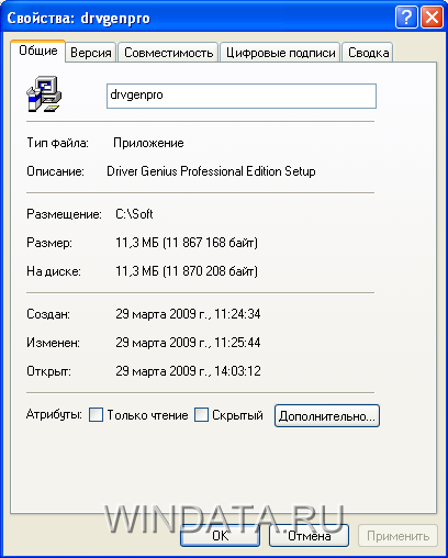 Если файл сам является программой, то для него этот раздел отсутствует. Далее на вкладке Общие последовательно указываются местоположение и размер файла, его размещение на диске, дата создания и последней модификации, а также дата последнего открытия.