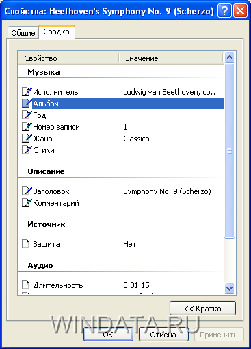 Вкладка Сводка окна Свойства содержит общие сведения о файле. То, какие сведения отображаются, зависит от типа файлов. Например, если это файл графического изображения, то на вкладке Сводка будут указаны ширина и высота в пикселях, горизонтальное и вертикальное разрешение, а также различные данные, такие как тема, автор, комментарии и т.д. Если же это файл текстового документа, то на вкладке Сводка будет отображена информация о количестве страниц, слов, знаков, имени автора и прочие сведения.