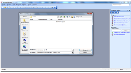 Для створення бази даних відкриваємо Access- «Нова база даних»потім натискаємо кнопку ОК. Появляється вікно Файл нової бази даних, у якому вказуємо ім’я файлу бази даних, у нашому випадку – «Автопродажа».