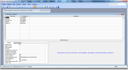 Після чого відкриється вікно бази даних. У ньому перераховані такі способи створення таблиць: створення в режимі конструктора, створення за допомогою майстра таблиць, створення шляхом введення даних. Обираю «Створення в режимі конструктора».