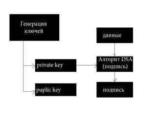 В данном случае используется алгоритм DSA с SHA1 (хэш-функция). Затем идет процесс инициализации подписи ключом. На этом этапе используется закрытый ключ, полученный ранее: